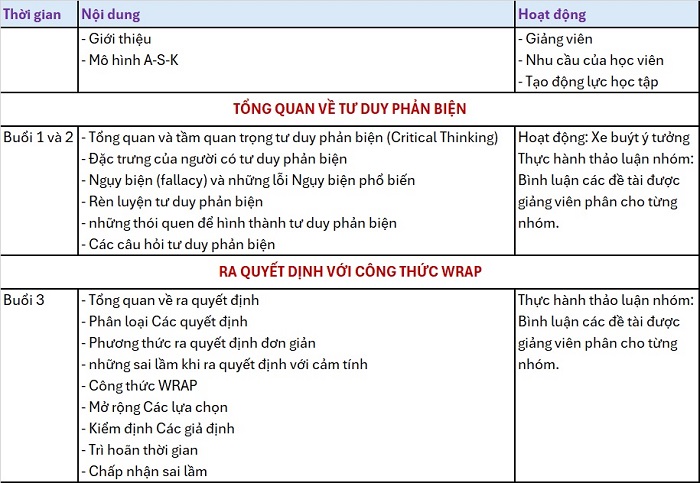Với kỹ năng tư duy phản biện, học viên có thể xử lý các thông tin, lập luận, nghiên cứu một cách chính xác, không chỉ hữu hiệu với việc học mà còn có ích trong các tình huống ra quyết định trong cuộc sống và công việc Trong suốt khóa học, người học được khuyến khích vận dụng các phương pháp về tư duy phản biện lên việc phân tích những vấn đề trong công việc nhằm giúp các bạn có khả năng “minh định” “phải trái đúng sai”.