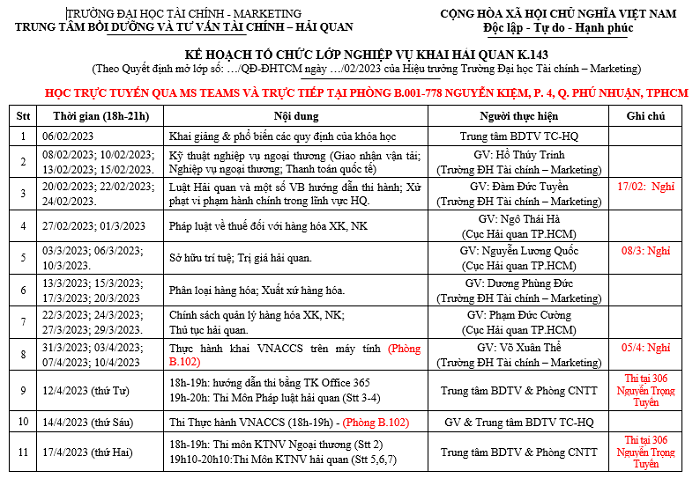 Lịch học khóa đào tạo Nghiệp vụ khai hải quan – K.143 (Đào tạo nhân viên đại lý làm thủ tục hải quan)