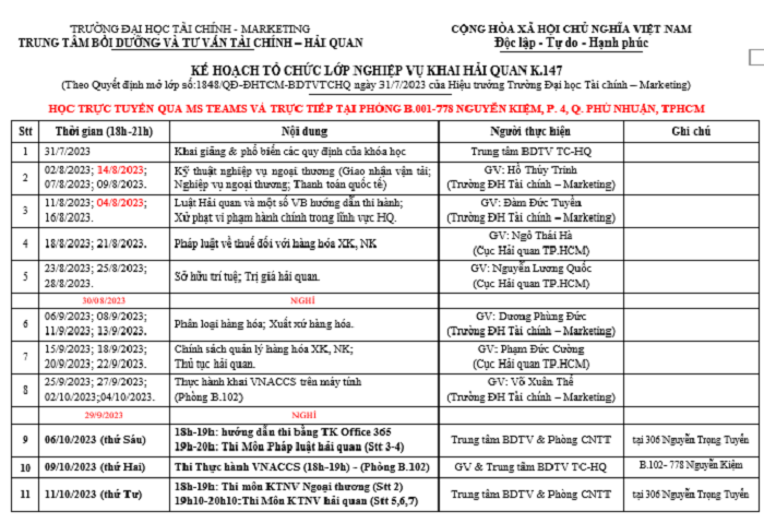Lịch học khóa đào tạo Nghiệp vụ Khai Hải Quan K147