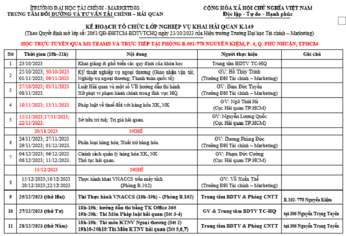 Lịch học khóa đào tạo Nghiệp vụ Khai Hải Quan K149