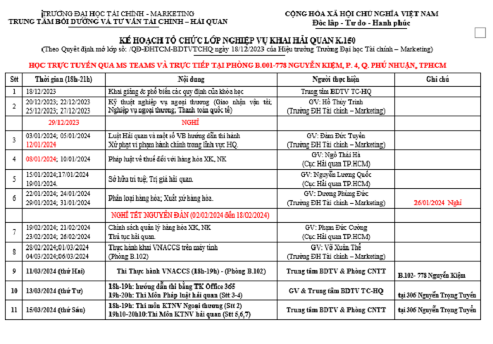 Lịch học khóa đào tạo Nghiệp vụ Khai Hải Quan K150